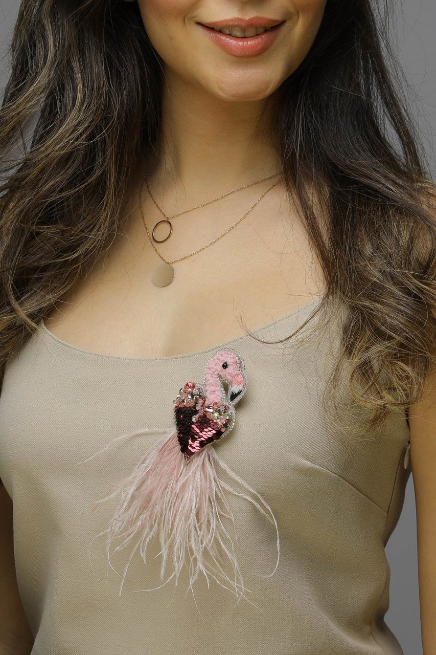İtalyan pul, asfor marka kristal taşlar, miyuki boncuk, dmc fransız nakış, swarovski taşlar ve tüylerle işlenmiş olan arkası deri broştur.