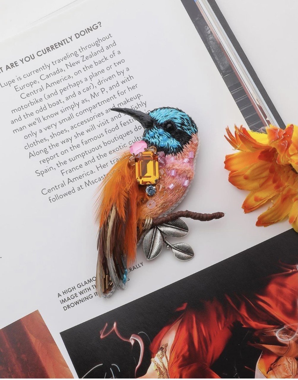 İtalyan pul, asfor marka kristal taşlar, Çek boncuk, miyuki boncuk, serme hindistan, dmc fransız nakış ve özel taşlarla tasarlanmış arkası deri broştur.